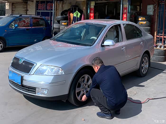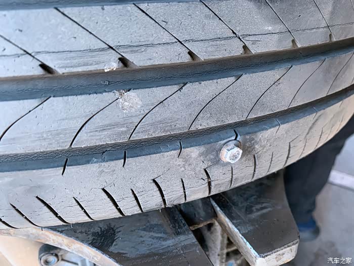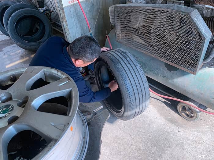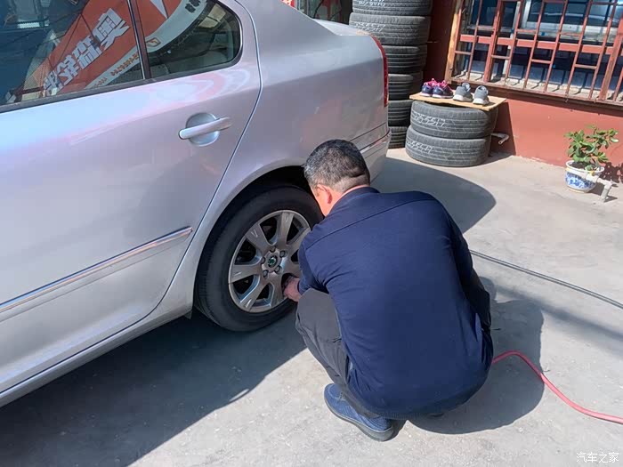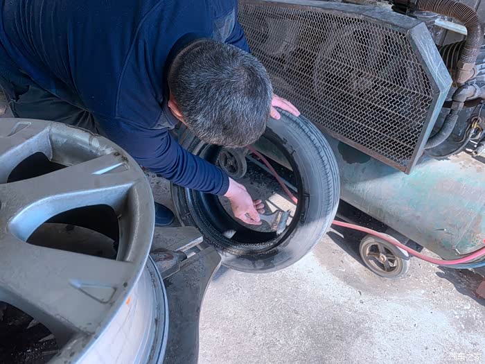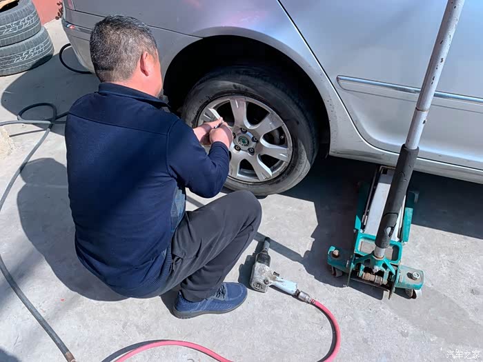 把车停稳后,补胎师傅就给右后轮轮胎进行拆卸。