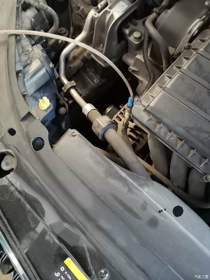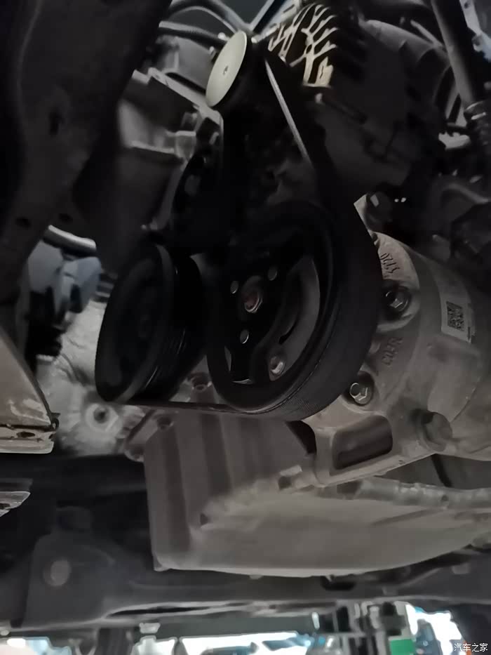 就是这一根,这个皮带连着启动电机,发动机,空调压缩机,很重要的,车友请注意检查。