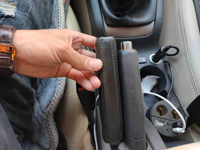 这是真皮手刹安装完毕,感受一下手感,然后在观摩一下这个颜值,在对比一下档次的确提升一大截