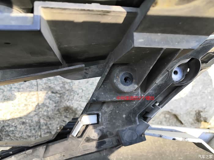 前保险杠底部M10螺丝7棵,快攻螺丝6棵,正中塑料螺丝膨胀钉2棵,靠近轮塑料按钉6棵每侧3棵。发动机舱中网连接上面M10螺丝4棵,上面快攻螺丝4棵,中网内侧斜向两侧各2棵。顺序去掉发动机舱中网连接螺丝4棵十字改锥作业,M10螺丝4棵M10套筒作业。