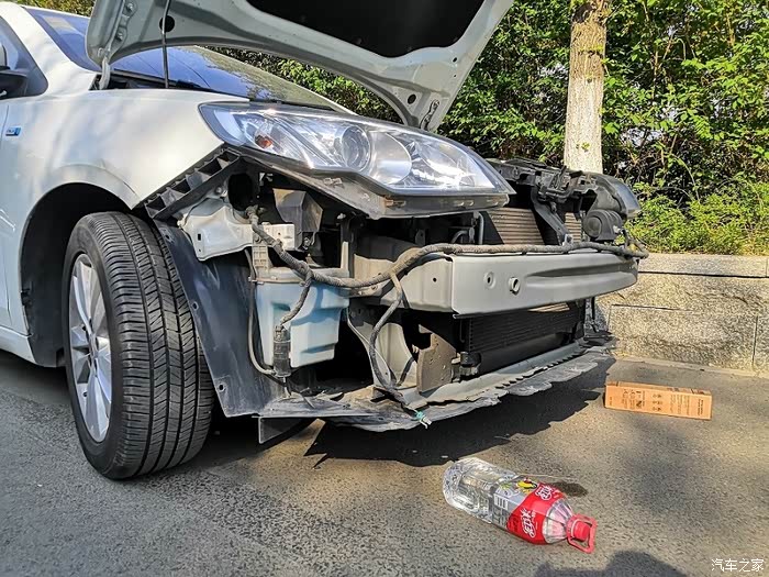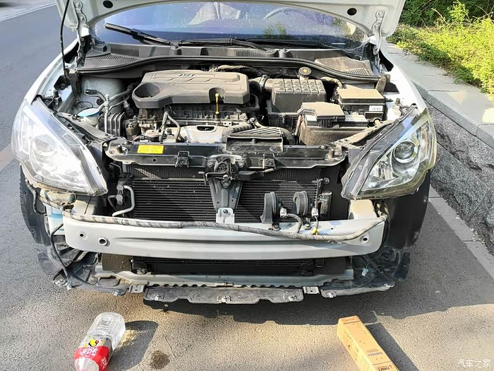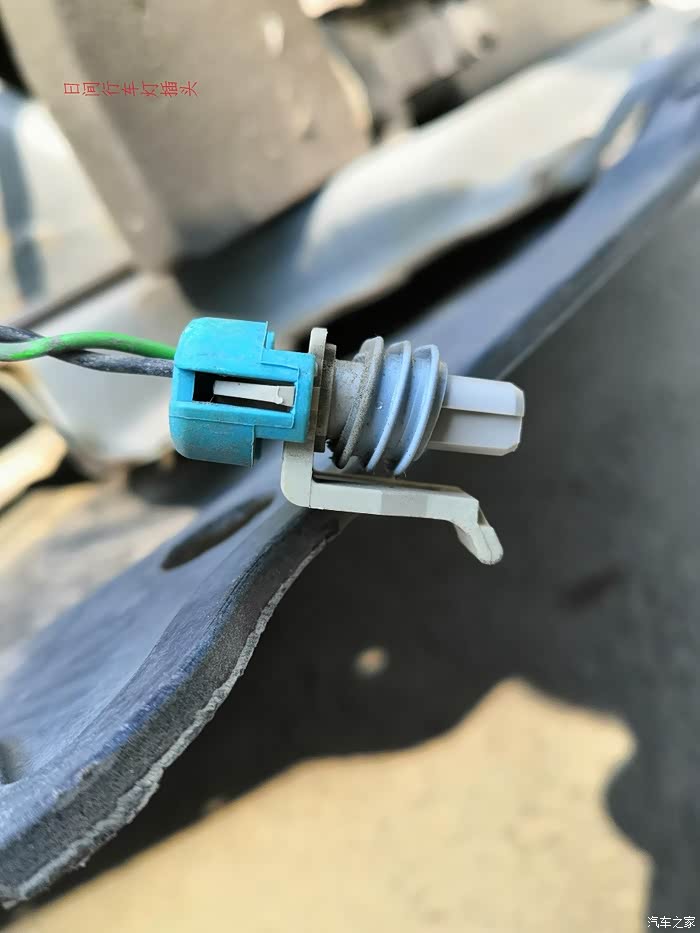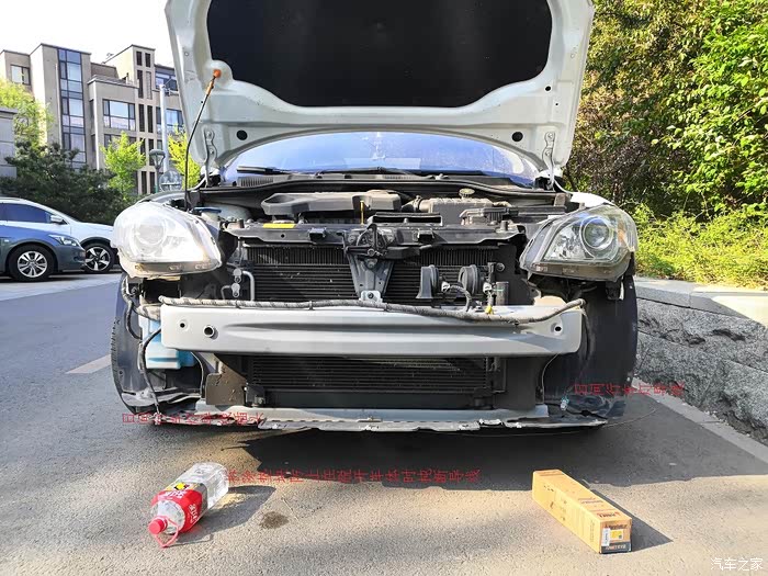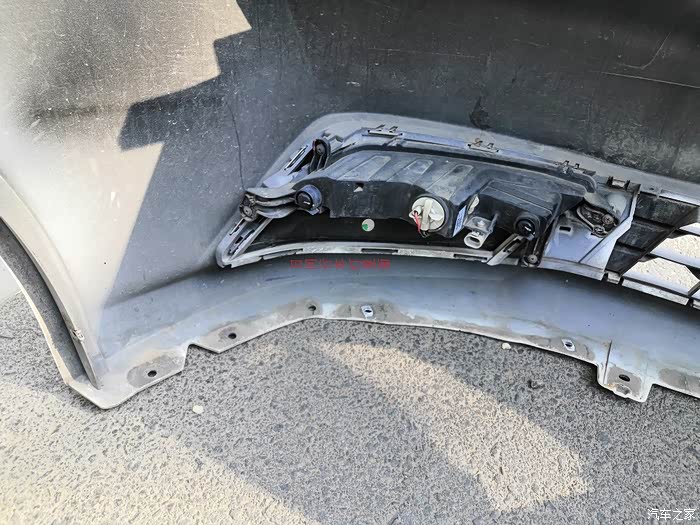 去掉所有连接螺丝后,保险柜两侧垫上支撑块防止脱落扽折日间行车灯电线,从一侧翼子板处轻轻往外扽DEN,左右晃动,两侧都松动松动,把发动机舱处中网从发动机盖锁扣扳把孔掏出来,往下拽,并松动着,这样前保险杠就脱离车体,完全取下前把日间行车灯电线扣拆掉,从锁扣底下一按就脱扣了,一定注意保护电线。至此前保险杠完全脱离车体。