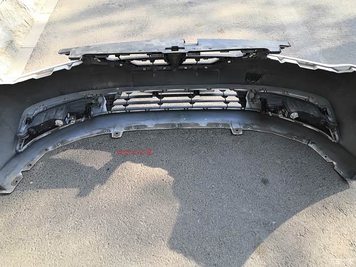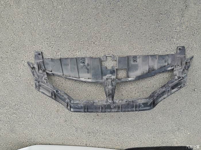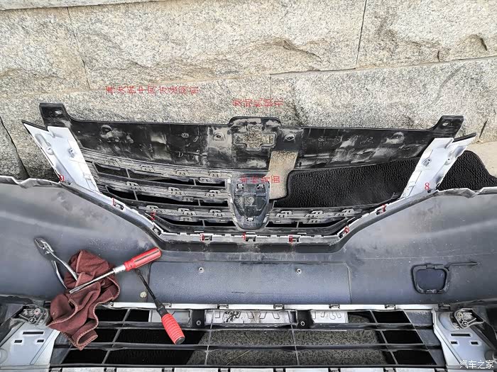把保险杠竖起来放,底下垫上垫子保护油漆面划伤。拆除第一层连接护网,从中间先拆除,向两侧方向拆,用两把一字改锥把塑料倒扣依次插入缝隙,把倒扣退出去。如此拆除掉。劲很大的,注意保护塑料倒扣易损件。拆除正面中网连同车标一起拆除,方法同上,容易一点了。