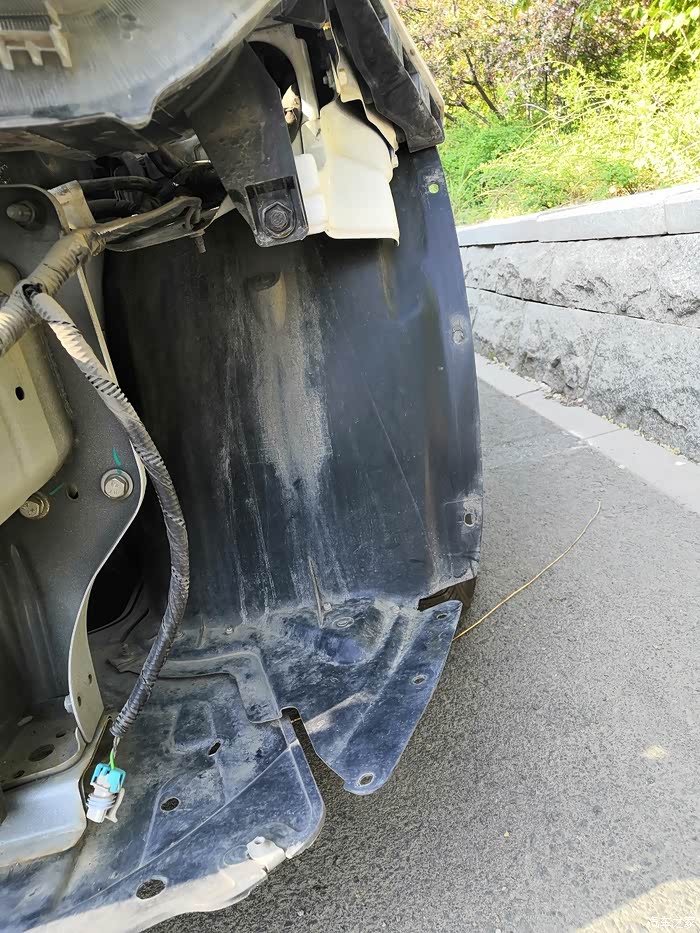 去掉掀开中网,两侧各2棵螺丝斜向45度十字改锥作业。去掉车轮两侧翼子板处螺丝,每侧4棵,正面3棵,斜向一颗。