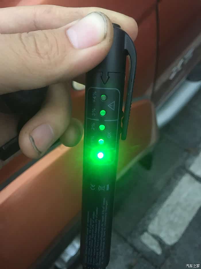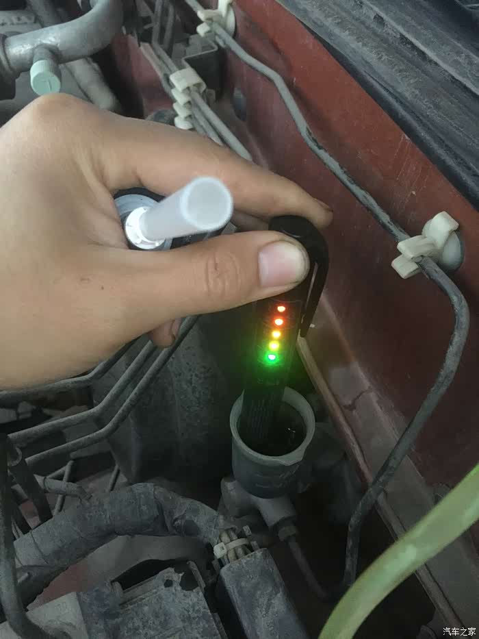 正常打开是绿灯。插进新刹车油里也全亮绿灯,我这个旧油已经红灯了,最高含水量。