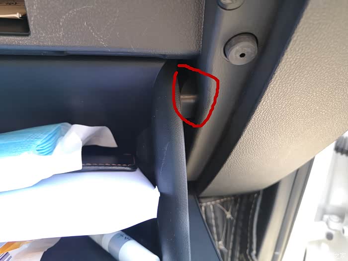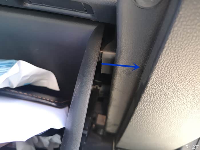 怎么把手套箱放下来,这个是关键步骤,放下来后就简单了,先要把那个挡扣往两边扣,按我键头指的方向,两边最好能同时,手指甲短的,可以用扁口的工具帮忙。