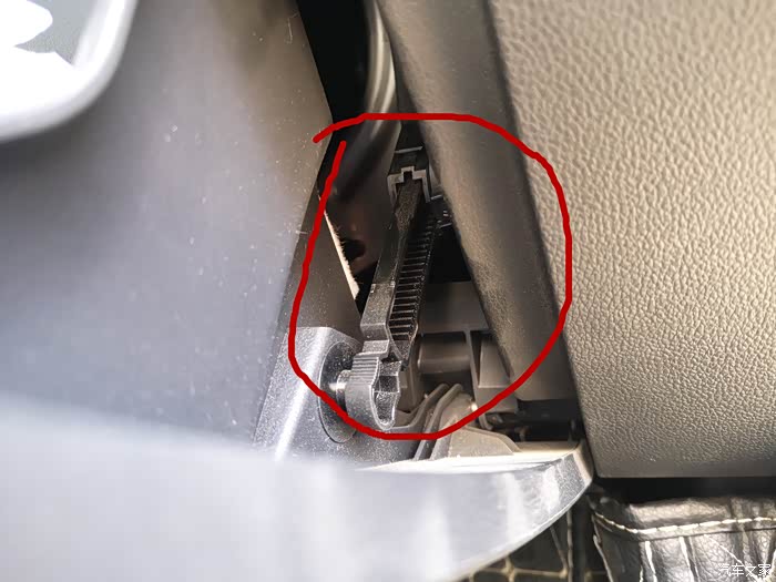 这两个我标注的地方,要注意,一个是挡扣,阻挡手套箱开合张口的,一个是阻尼器,不要弄坏了,一定要小心点。