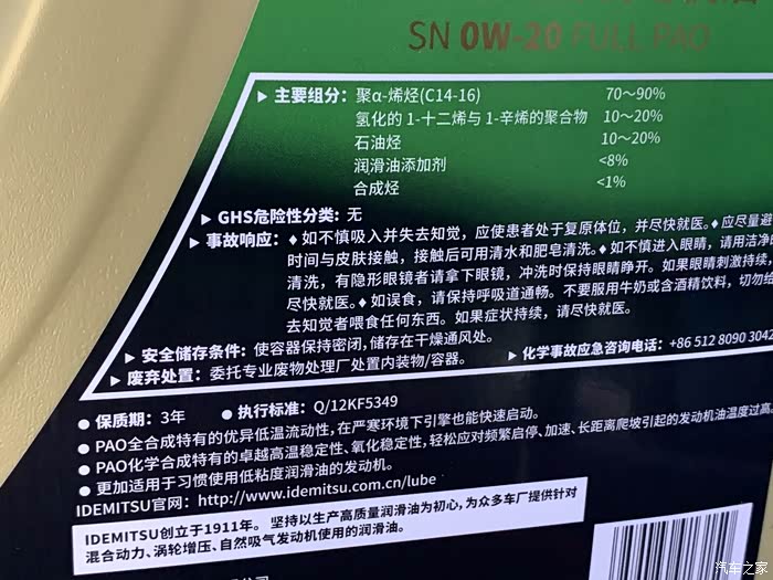 夏天到了,距离上一次换保养换机油差不多过了有6500公里,考虑到0-20的油一般衰减快,以及万一“五一”假期要出门跑个长途呢,所以决定最近把机油换换。劲炫的说明书上没有明确标定究竟用那哪种标号,大家可以自己翻看,只是要求必须满足的最低认证标准,这个标准不高,说明书说的是满足认定标准的0-20,5-30或0-30,0-40都可以使用,可见发动机是不挑食的,大家大可不必过于纠结,4S常用的还是5-30,比较中庸。车友喜欢的大多数是0-20,省油轻快。关于机油的知识网上说的很多,我就不多嘴了,大家有自己的见解。 最近这两年来,我一直用出光的油,几乎把出光各个型号的用了个遍,从普通的5-30,C3的5-30以及普通的0-20,带钼离子的0-20,这次用了一个没用过的,PAO基础油的0-20。总的来说,恕我直言,都差不多,心里作用大过实际作用。起码我感觉不出来啥,只能说贵点的油让自己觉得更自信?????哈哈
