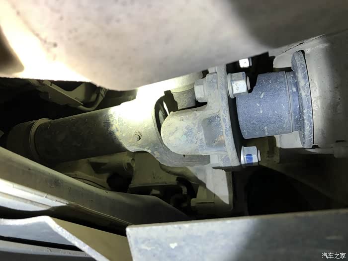 拍了照片肯定是直接钻到车底开始保养清洁胶套啊,不管什么球笼啊,缓冲胶套啊,平衡杆固定胶啊,摆臂胶什么的,只有是胶,我都给喷了矽质养护剂擦了再喷点。这是后传动轴