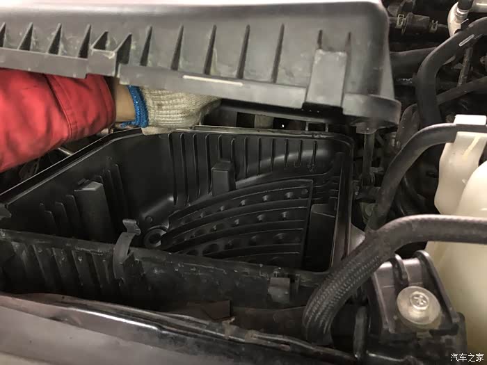 虽说空滤还没到,但有必要打开吹吹灰,记得用毛巾堵住师傅的手遮住的这个位置。因为里面就是直接进入发动机的管路了