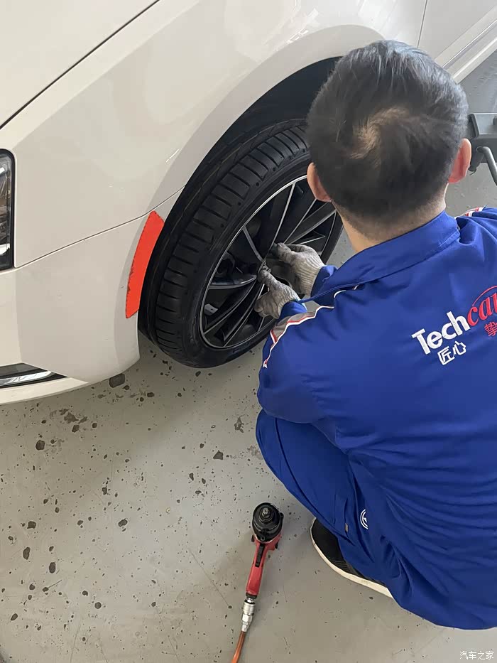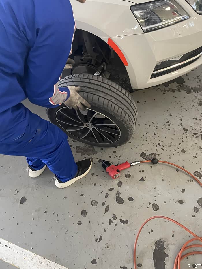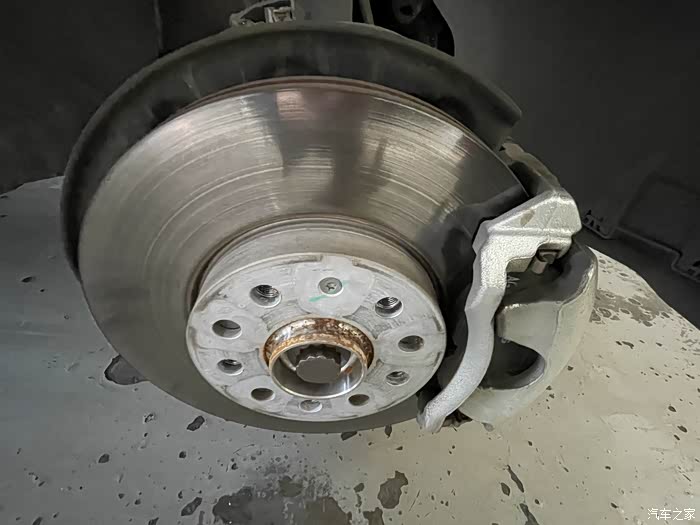 换胎过程就比较常规操作了,很快地就卸下来了,不得不说此款车的刹车片非常地厚,然后售后说这款刹车片很耐磨,基本上十万公里才需要更换,难怪经常有异响,耐磨噪音当然大了