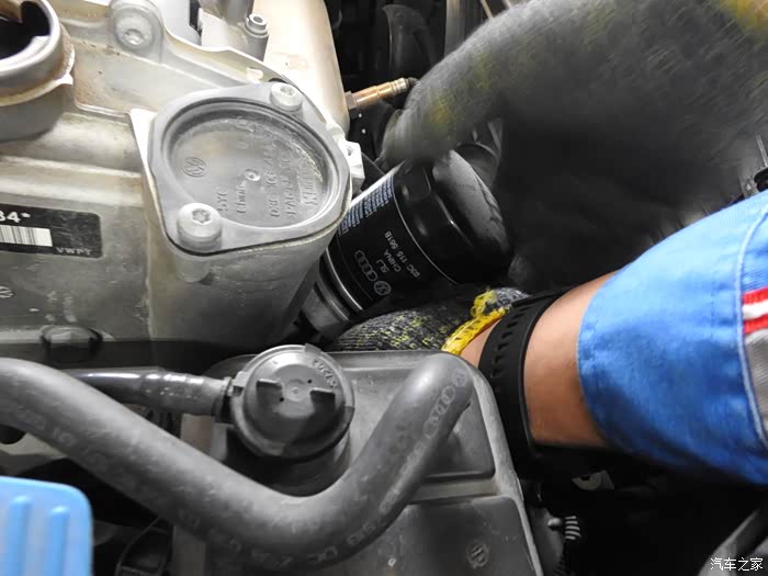 降下车后。拧下旧的机油滤芯。