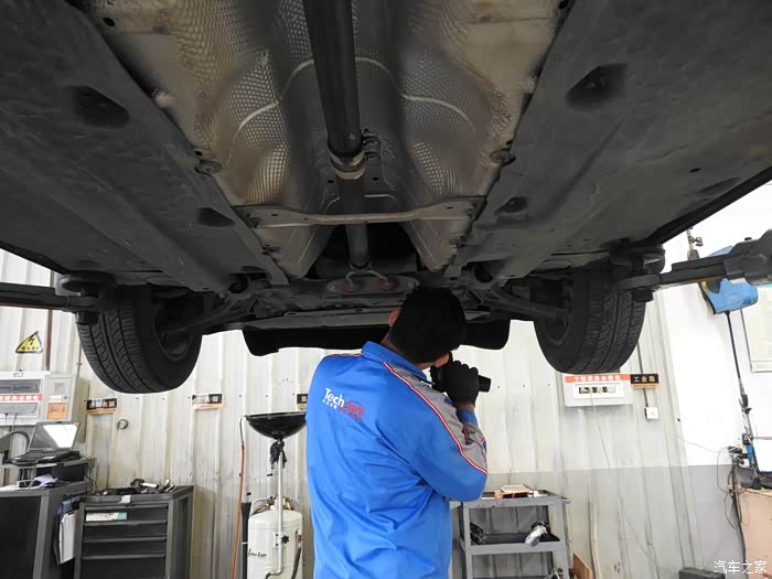 保养的师傅蹲下身子,仔细检查举车台有没有到位。