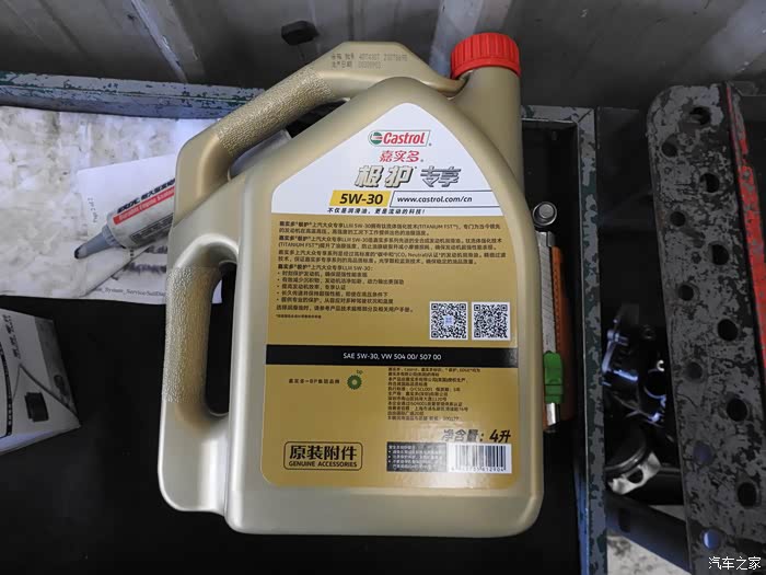 机油拿过来了。这个是背面。有相关的说明以及合作的斯柯达的二维码。