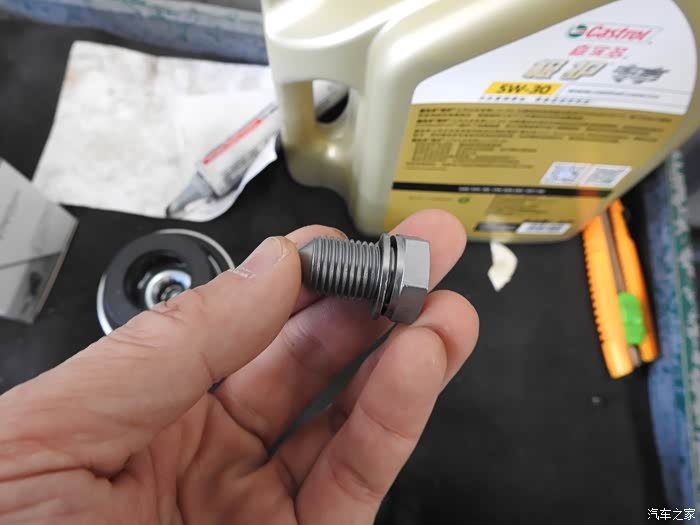 放干净之后。换上新的放油螺丝并拧紧。