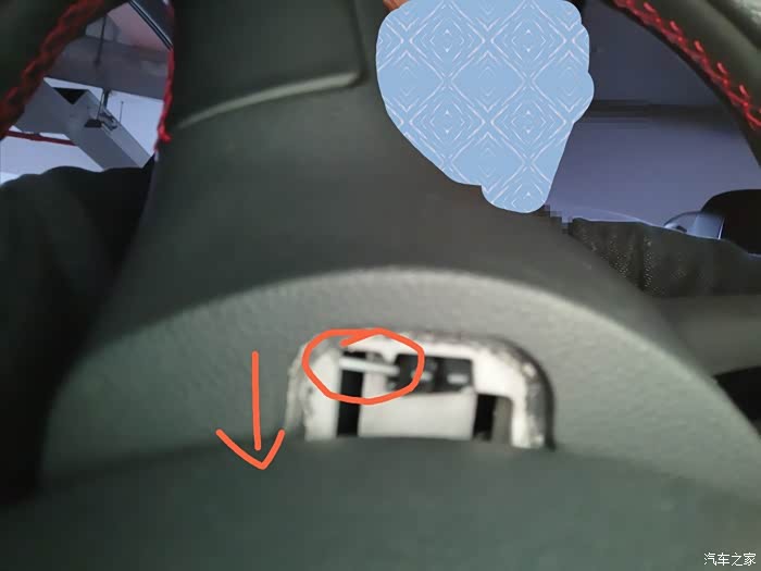 向左旋转方向盘90℃,用一字螺丝刀向下拨红色画圈的金属卡子,气囊一边会弹出来一点。