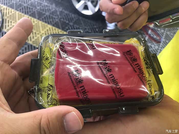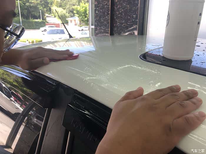 施工的小哥很仔细的用火山泥推除漆面污渍,大多数污渍已经被铁粉祛除剂弄掉了,火山泥的作用就是把那些顽固污渍彻底的带走,起到二遍清洁的作用。