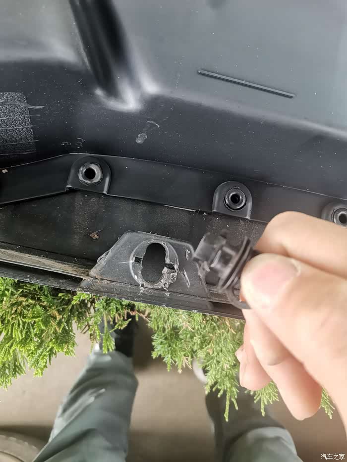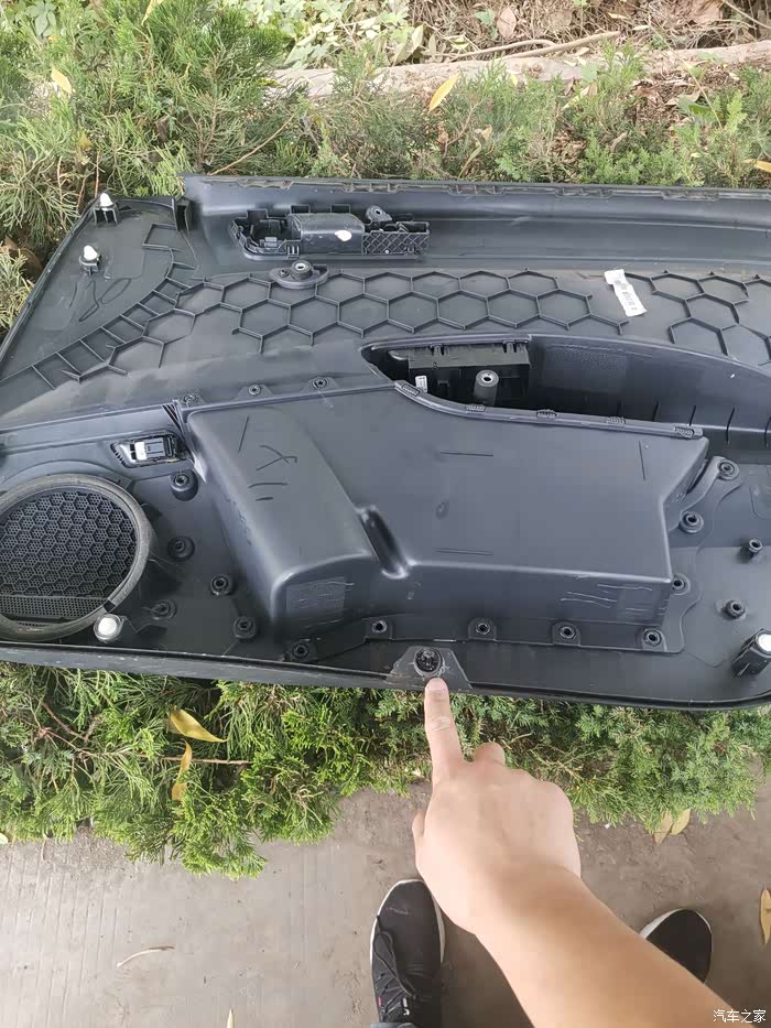 这样能看懂吧,就用扳手把卡扣弄垂直即可,这个螺丝应该是要固定在钣金门板上的,不属于塑料内衬板的一部分。从下往上所有卡扣拆完,把门板往上一抬,就能下来,力气可以大,但是幅度不要大,因为门板上还有线束。扯断了就哭吧。