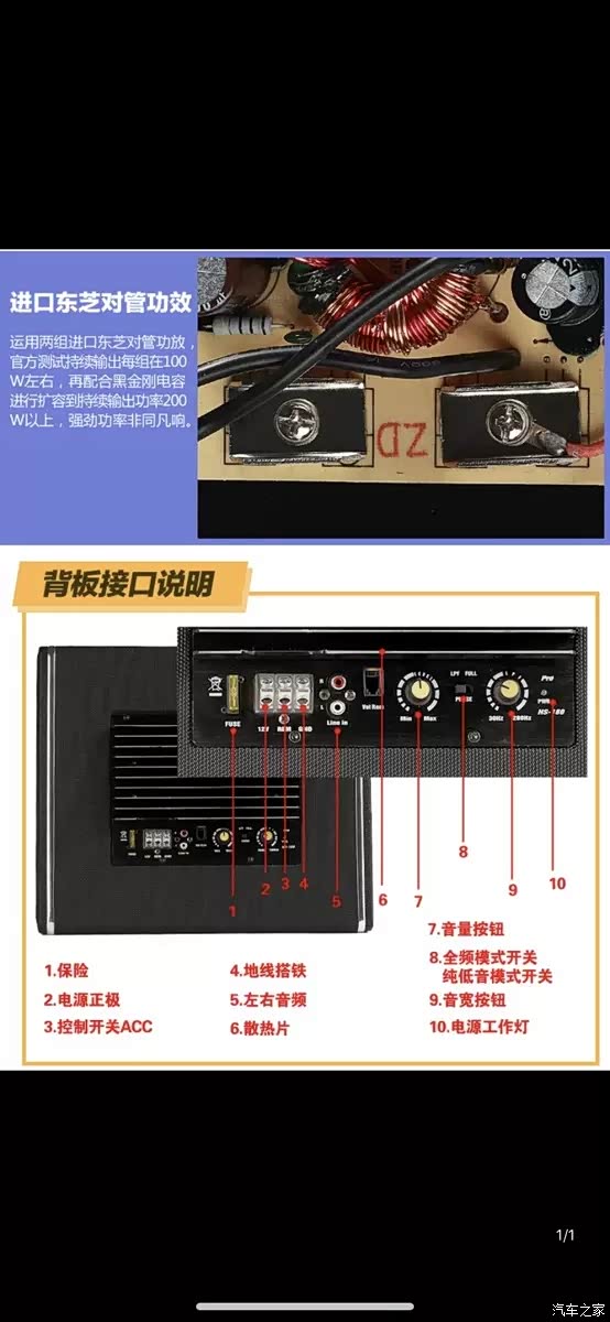 改好后低音效果还行,要求不能太高,就是音响电源线小了点,10号的线,以后在换8号线,还有保险丝配的60a觉得太大了,后面淘宝换个40a的,电源线正级接acc就行,接好试车低音效果还行,有点ktv的效果。正级接电池正级,中间加个保险丝,负级接搭铁,