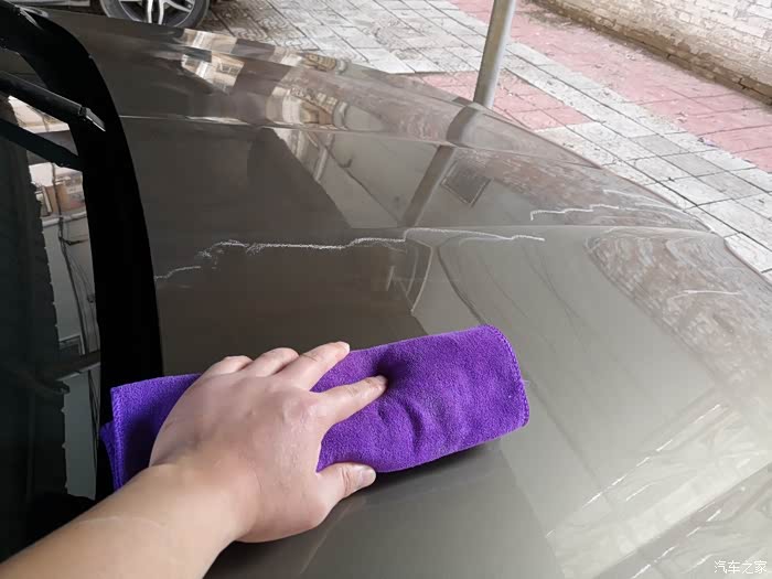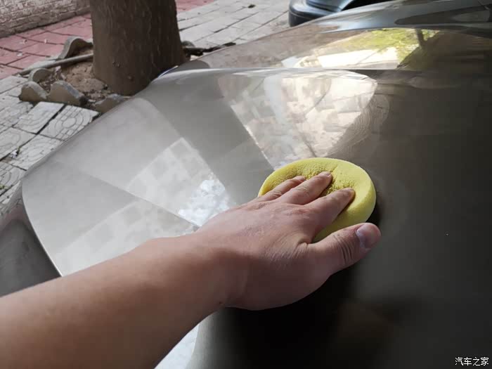 车身完全晾干后开始打蜡,先从前机盖开始。