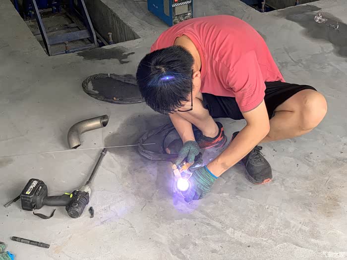 尾喉初步固定好后,老板开始切割原车的两个大牛角,再按后改尾喉的角度用电焊把相同管径的不锈钢管焊接起来,架到新尾喉处。老板手下刚好没有小工,于是老板娘来顶上了。