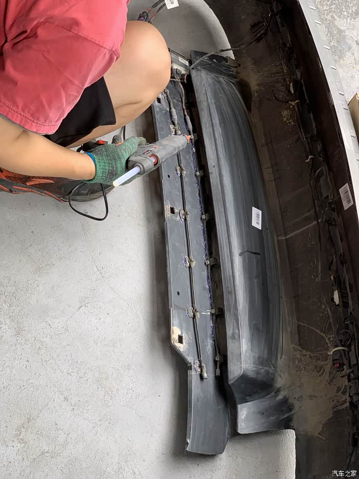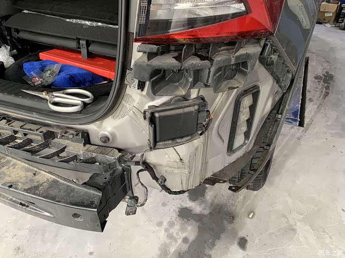 为了不影响原车功能,原车自带的6个尾部雷达传感器和一脚踢感应线路及控制盒也同步一并挪到低配后保上。
