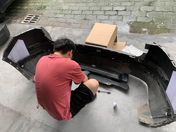 接下来就是比划好需要安装的尾喉大小和位置,用小电磨慢慢切割塑料后保,边修整边固定位置,这个工序花费的时间较多。