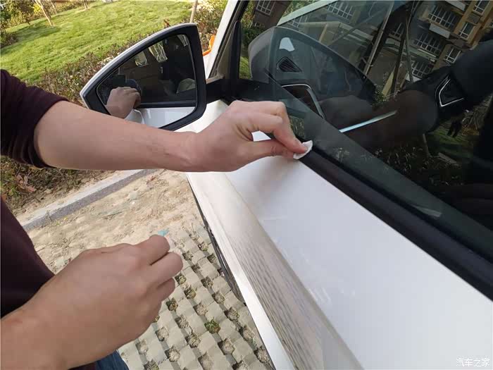 小后窗这个是整体的,要先比对好,再下手,从下面往上赶,边粘边撕。