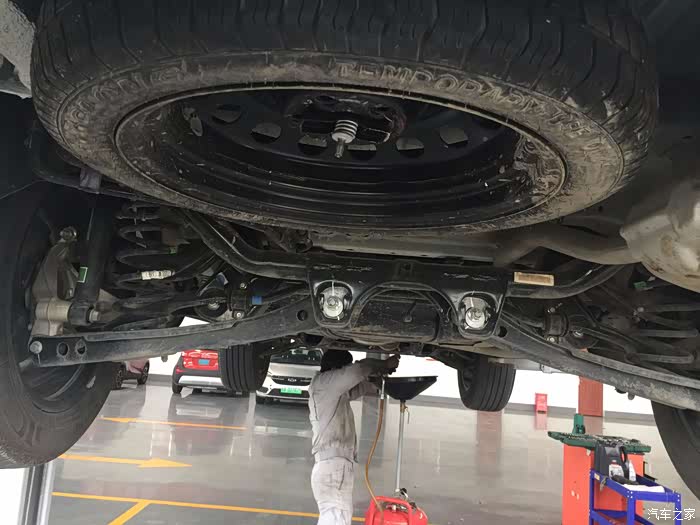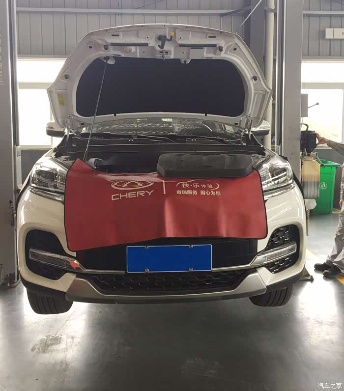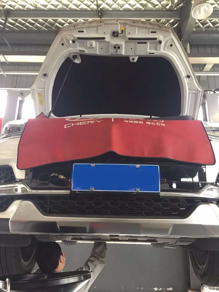 车开到起重机上,保养师傅很细心,因为是刚洗完车的缘故,师傅怕弄脏,特地用红布盖起来。