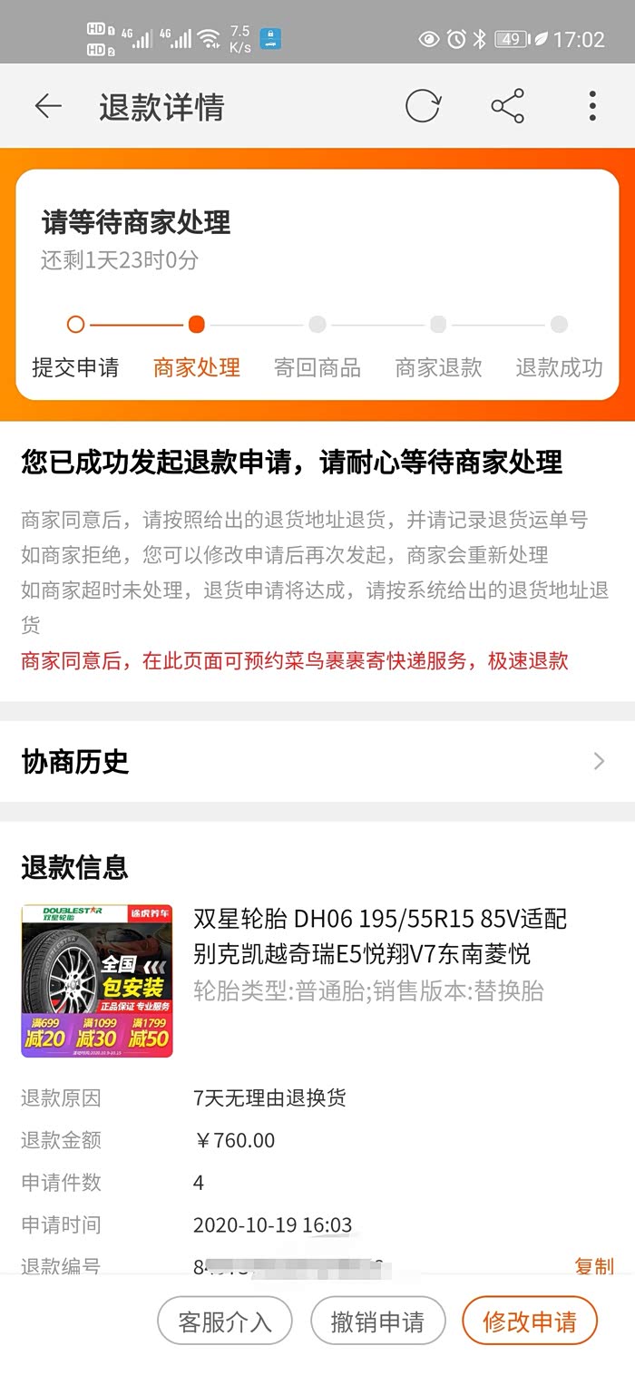 我就联系途虎客服,说要退货,然后这个安装店的师傅说让我支付50元拆装费,新轮胎就留在店里,在订单中申请退货就行了。不要运费!!!我说这个钱需要我掏吗?他说要,这个费用是他们的拆装费,跟途虎无关,我就在客服那留言说明了情况,然后支付了50。
