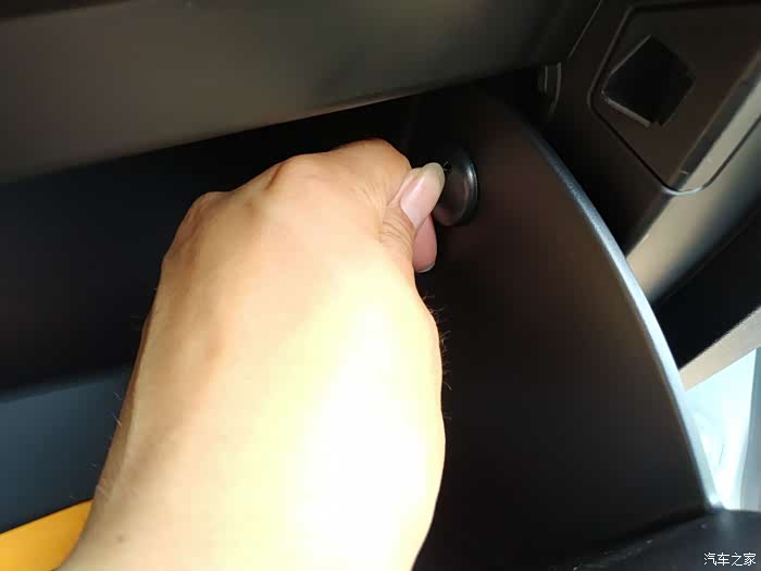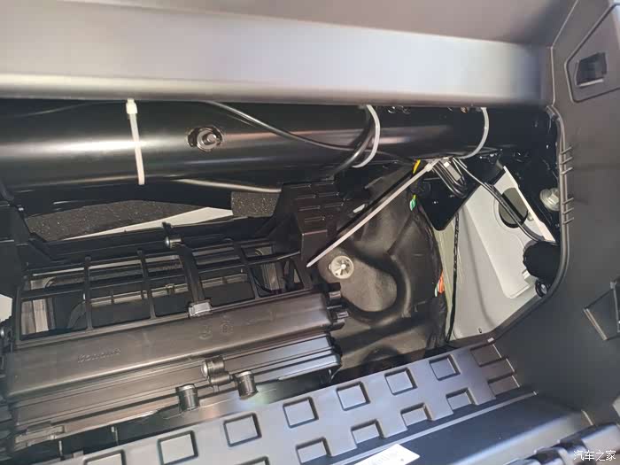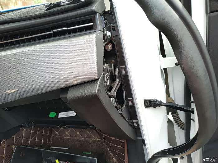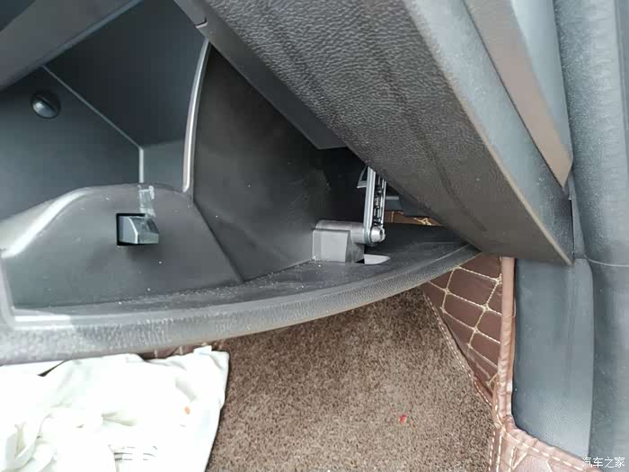 先把副驾驶的储物箱拆除,这是连接杆,往外一抠圆凸头的地方就下来了
