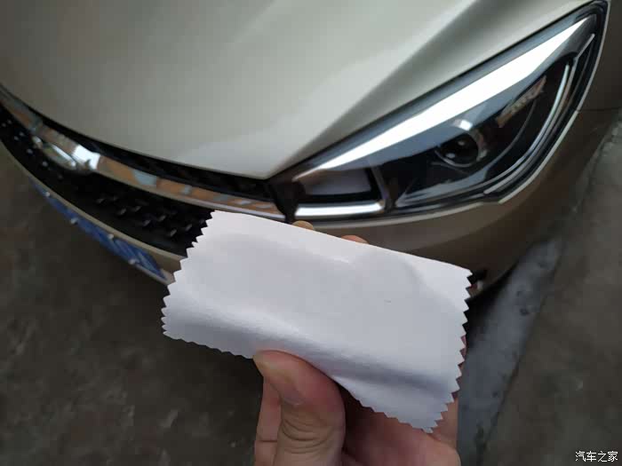 把镀晶液倒在棉布裹着的海绵擦上,就可以涂抹在车漆表面了。