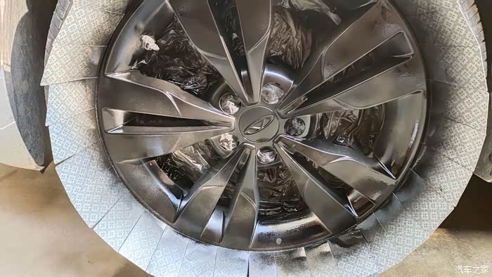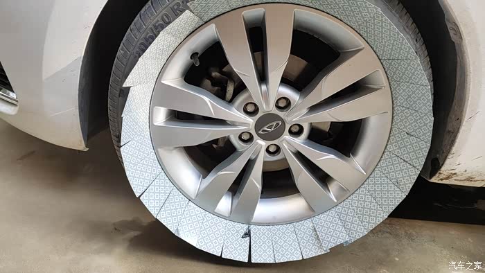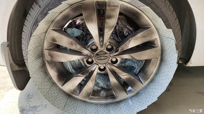 边上缝隙差完牌之后。然后找塑料袋把里边的刹车盘挡一下,这样到时喷的时候就不容易把里边也喷上了。造成花色着色不匀!其实有条件的可以把轮胎拆下来喷,这样喷的效果是最好的。而且颜色均匀那个喷膜的时候能达最佳