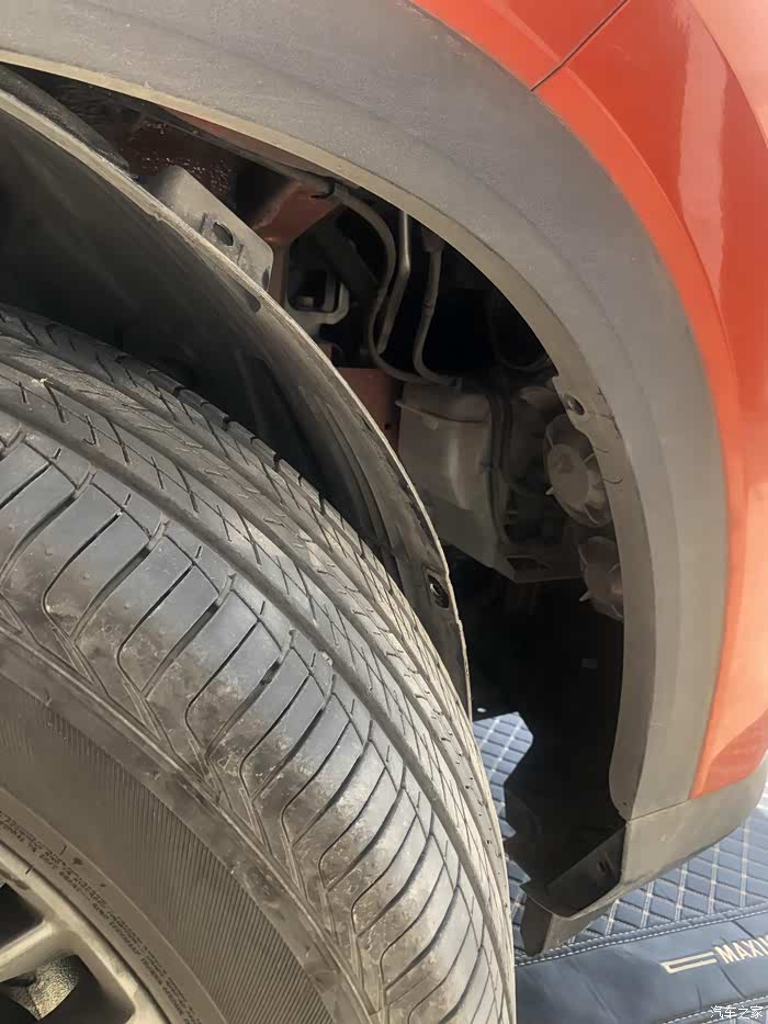 将靠近前保的翼子板内衬上的卡扣拆开,将内衬扒开即可,同时注意轮胎需要往外侧打到底。