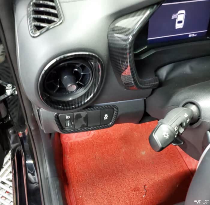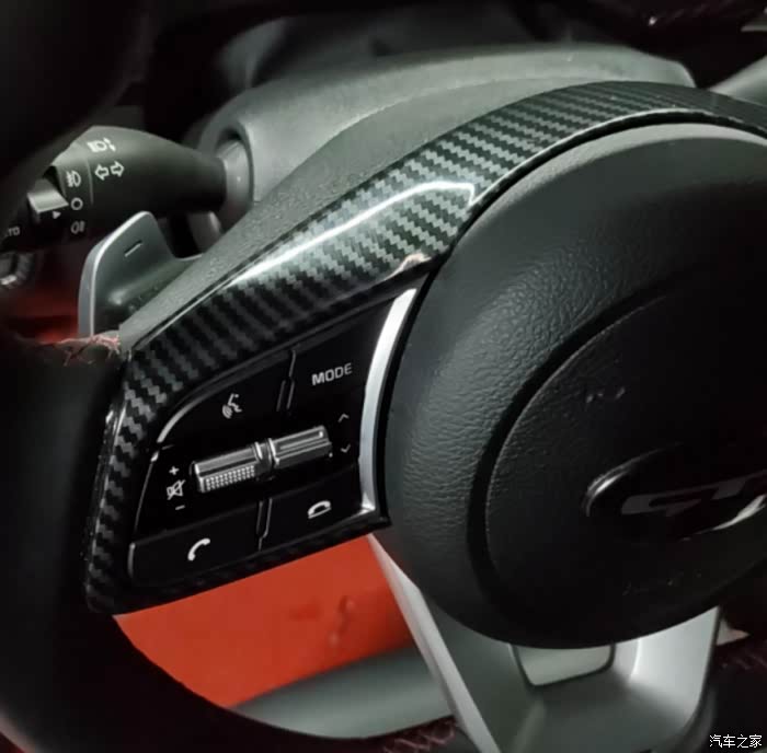 我太喜欢这个空调出风口了,就像战斗机的引擎口。不出你们所料,出风口与仪表也都是碳纤维上身,真搞不懂起亚,这么运动的一台车,就不能出一个碳纤维内饰选装包?如果出碳纤维内饰选装包,我肯定会买这个选包的,前提是别太贵就行。
