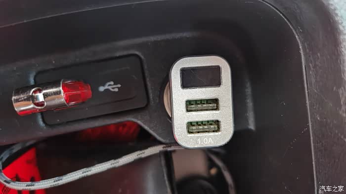 打开扶手箱看到点烟器上的车充插头指示灯是熄灭的,说明不通电。
