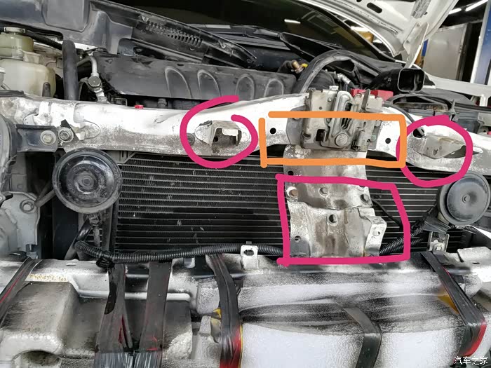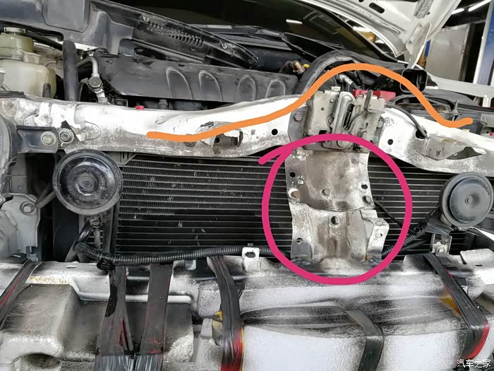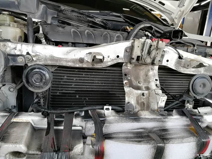 上次问题没发现,使用后趁着机会修正。防撞钢梁又附加了塑料发泡棉。厚实弹性足。冷凝器的水渍是下塑料护板碎了,地上水雾又打湿。检查了几番。
