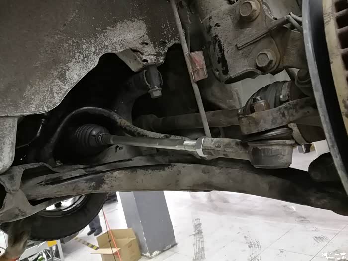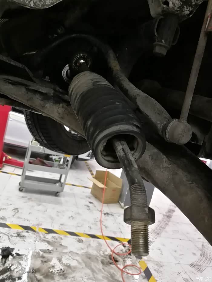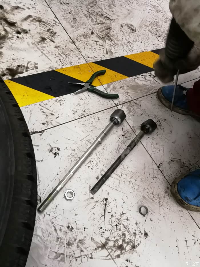 已经拆开的拉杆,可以看到变形的拉杆,有些车友四轮定位后还是感觉方向不精准可以更换这个一对配件。重新四轮校正前轮定位。