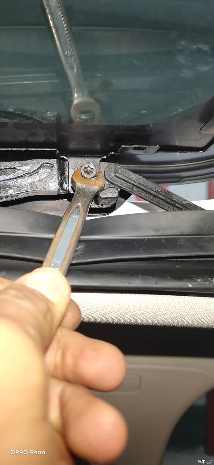 后边两个螺丝都松开,操作时注意别把玻璃敲碎了,毕竟螺丝在天窗的一角,也是玻璃的受力点,谨慎为好。