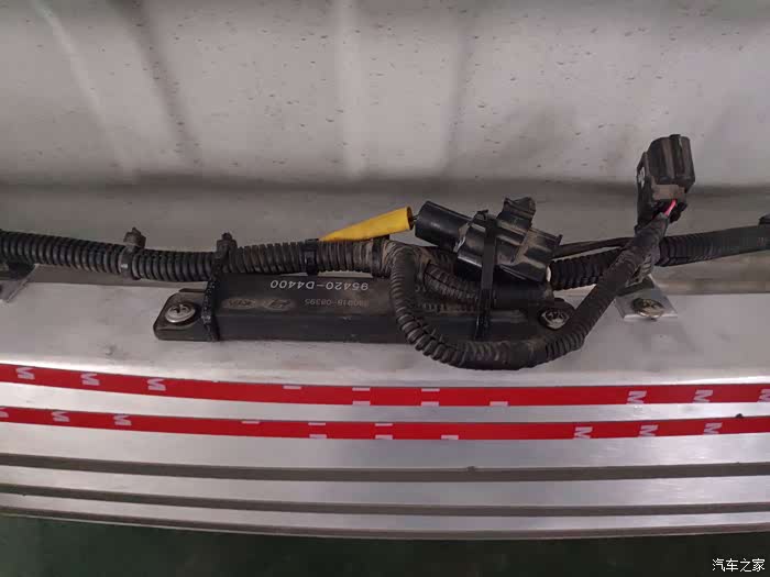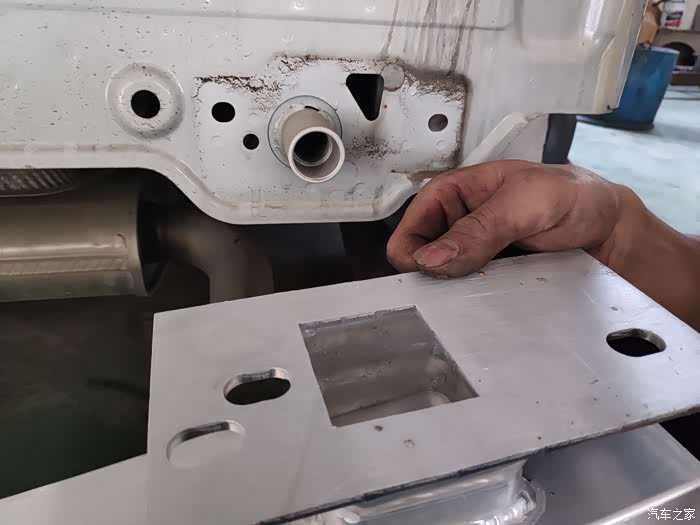 这是后拖车钩位置,在铝镁合金梁的吸能盒中间,遗憾的是梁外面没有开孔,所有安装这条梁后这个后拖车钩就用不了了。