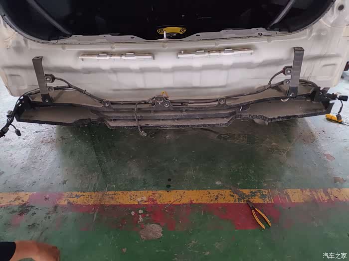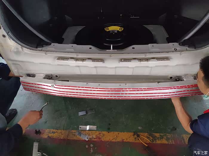去掉后护杠后,很清晰看到所谓的防撞梁是烂塑料做的,而且中间部分很空,一旦被追尾,后果很严重。