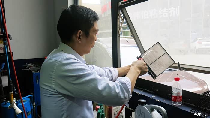 车间师傅将空调滤芯取出,用气枪吹里面的灰尘。