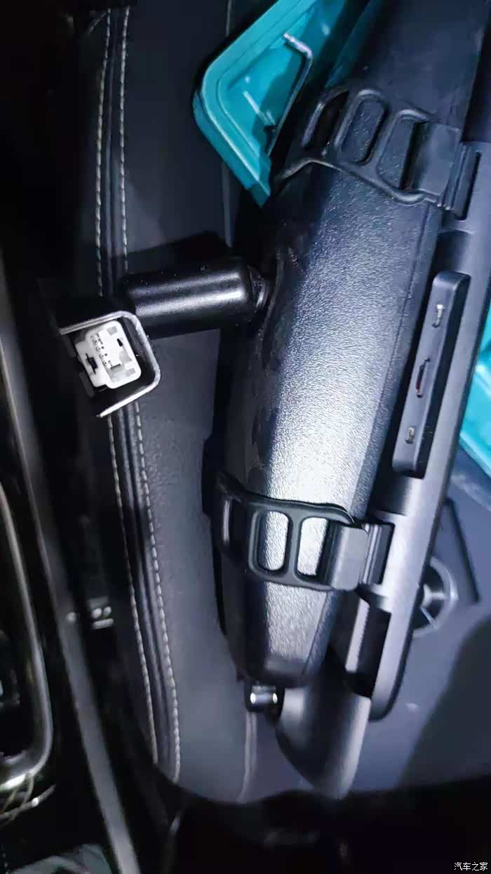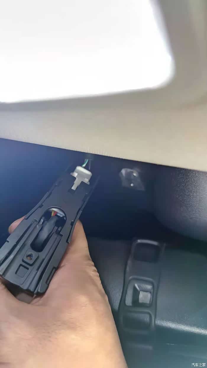 取下来的原车后视镜。取的时候第一步现拧下前档上的一颗固定螺丝,是内六角的。。。。第二步,往车顶方向小心拔出后视镜支架。。。图中白色插口就是后视镜的电源接口。。。。