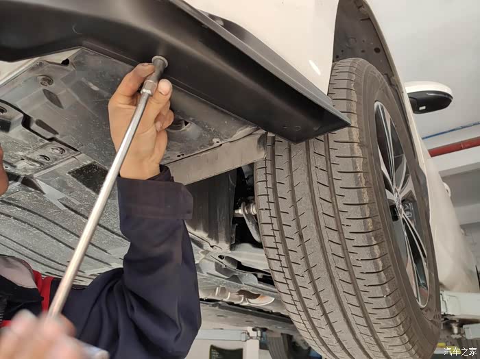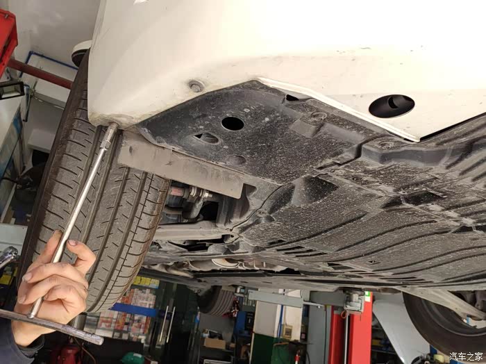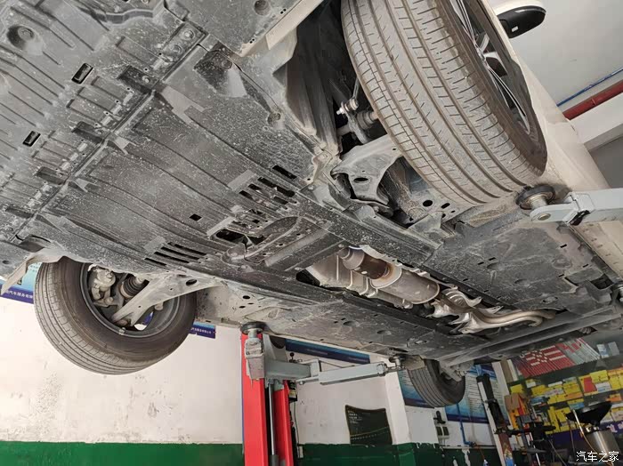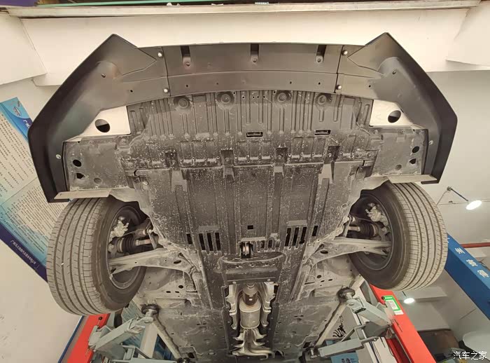 轩逸被升起来了,裙底全貌尽收眼底。整个来看轩逸的底盘用料还是非常用心的,这个底盘全部都使用了黑色塑料饰板给包裹覆盖起来了,除了排气管之外,整体的感觉就是非常的平整,舍得在底盘上这种一般都看不到的地方这么用心,我觉得还是比较少见的,尤其是对于这种十来万的合资车型来说