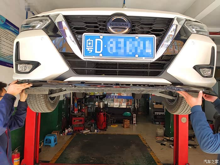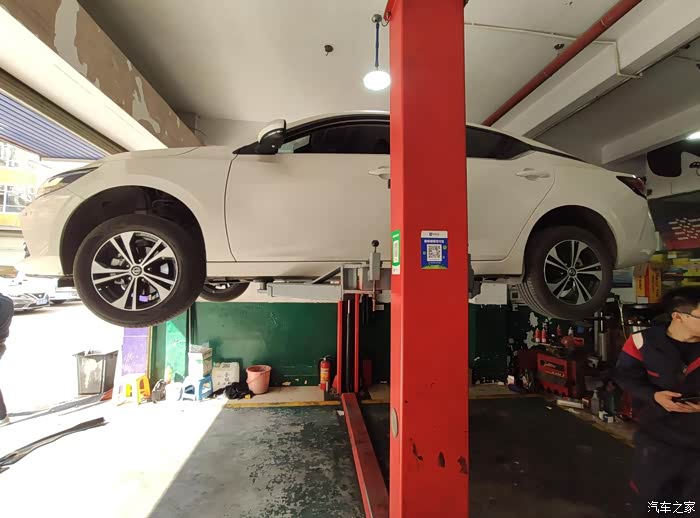 话不多说,直接进工位,上车举升机,先把轩逸整体抬起来。