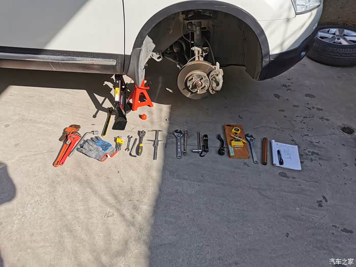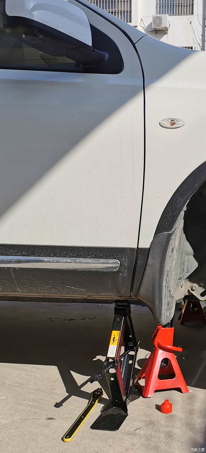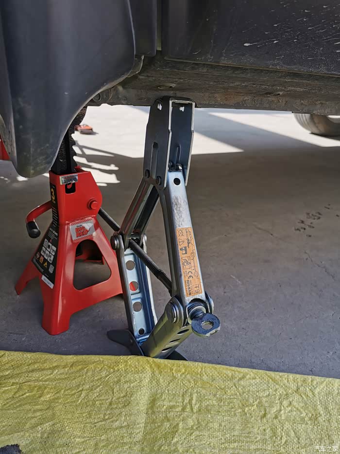 用千斤顶把车支撑起来,为了安全,顶起后放上安全支架。为了提高效率,我用了2个千斤顶,一边一个。