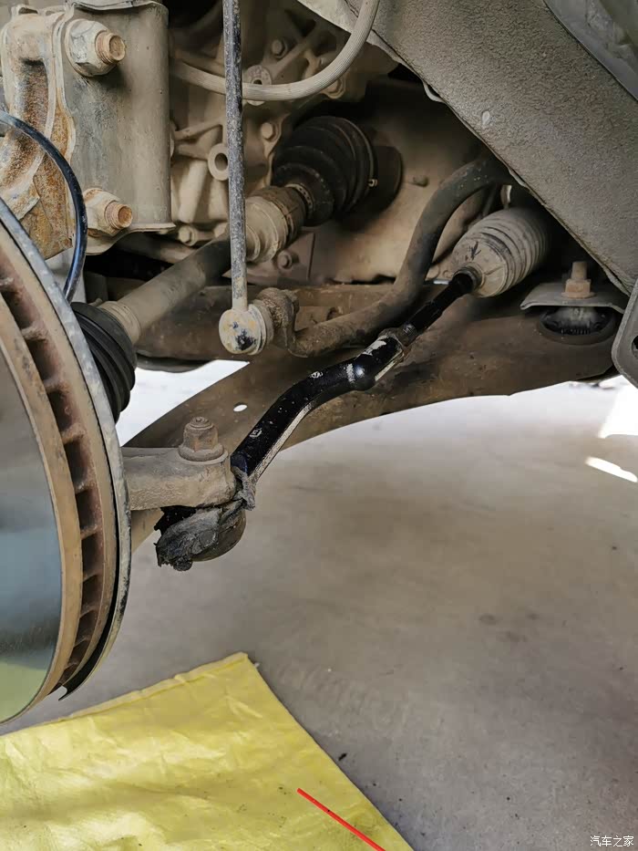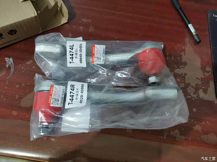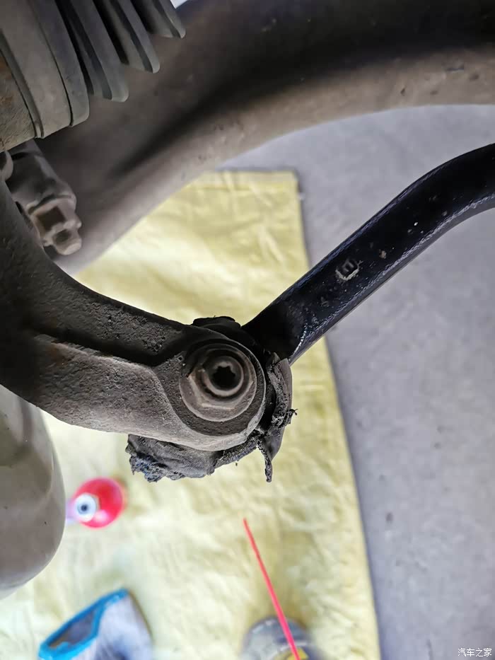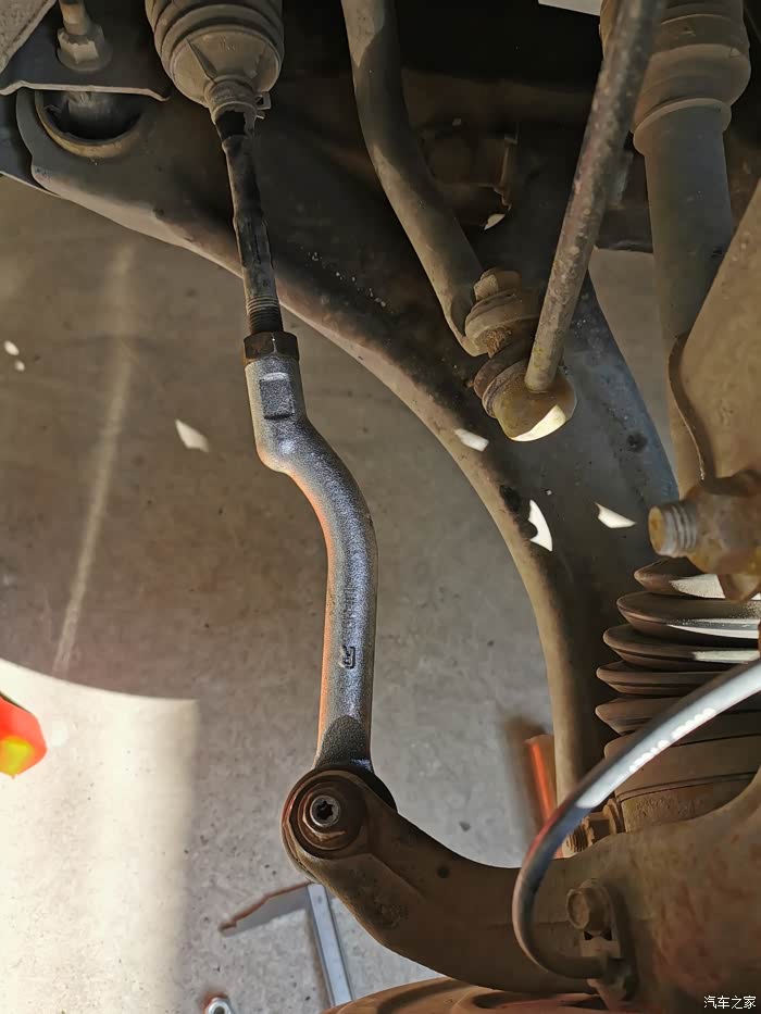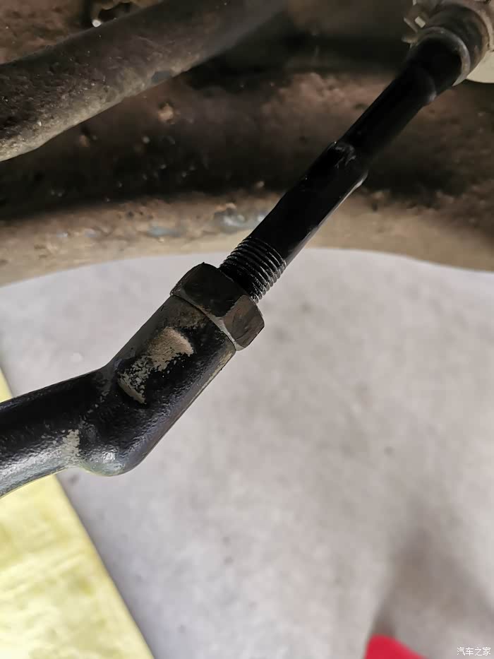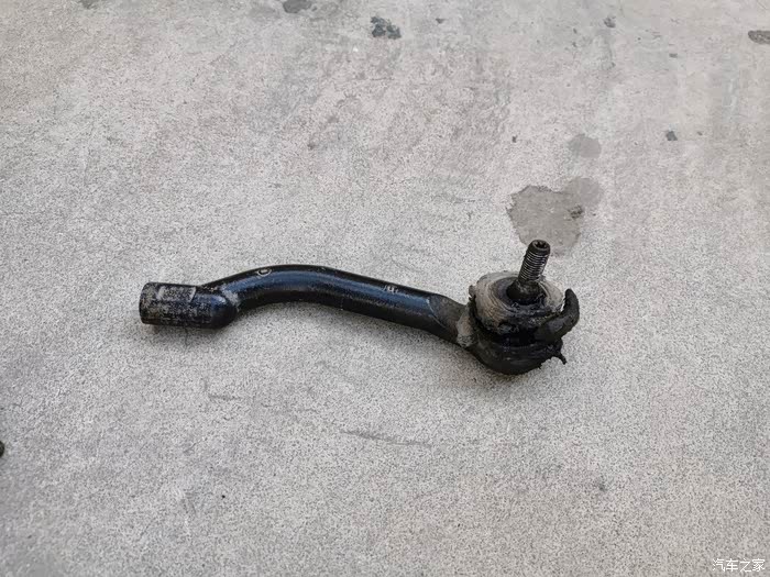 拆下的旧拉杆球头,防尘套都烂了;拆下时记住外拉杆退出的螺纹圈数,右侧球头拉杆用了15圈半,左侧球头拉杆用了17圈。