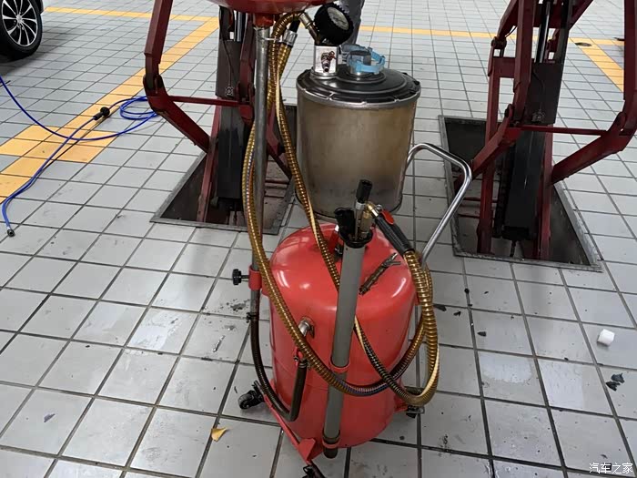 这是专门用来更换机油的设备,来4S店保养就是专业,看地下没有油迹,清洁卫生很到位。