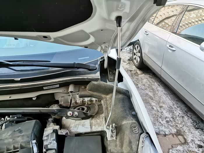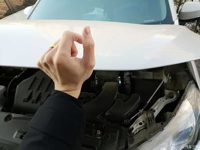 然后三菱标志上面有一个金属开关,往旁边拨一下机舱盖就能抬起来了