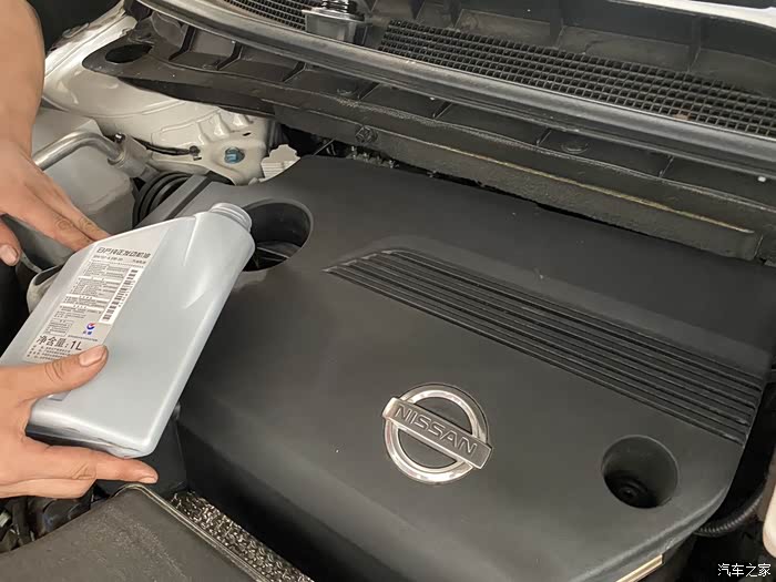 放完机油以后,就可以添加新的机油了,技师的手艺很不错,也很稳,不需要借助任何工具,一滴不漏的把机油加到发动机里。
