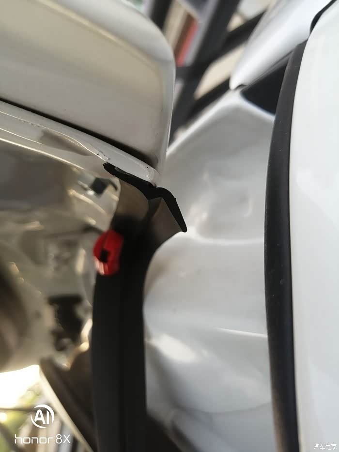 开始贴前门与叶子板之间缝隙用Z型密封条,这里是个细法活,不好伸手,还有一个弯,这个地方得慢慢贴,先把密封条从门轴,穿线管后面从下往上穿上去先贴上面往下一点点的赶,动手能力强的自己贴就行,手笨的只能找洗车美容店了。